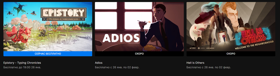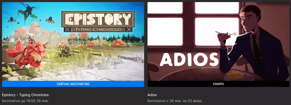 Сейчас в Epic Games Store дарят Epistory Typing Chronicles. Изначально предполагалось, что с 26 января по 2 февраля в EGS будут дарить лишь одну Adios.