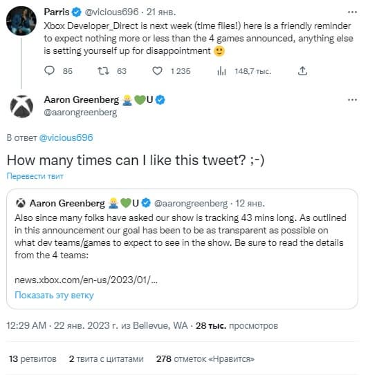 Блогер Parris сообщил, что Microsoft в данном случае «играет в открытую» - на мероприятии речь пойдёт лишь о четырёх играх, на что положительно отреагировал глава маркетинга Xbox Аарон Гринберг.