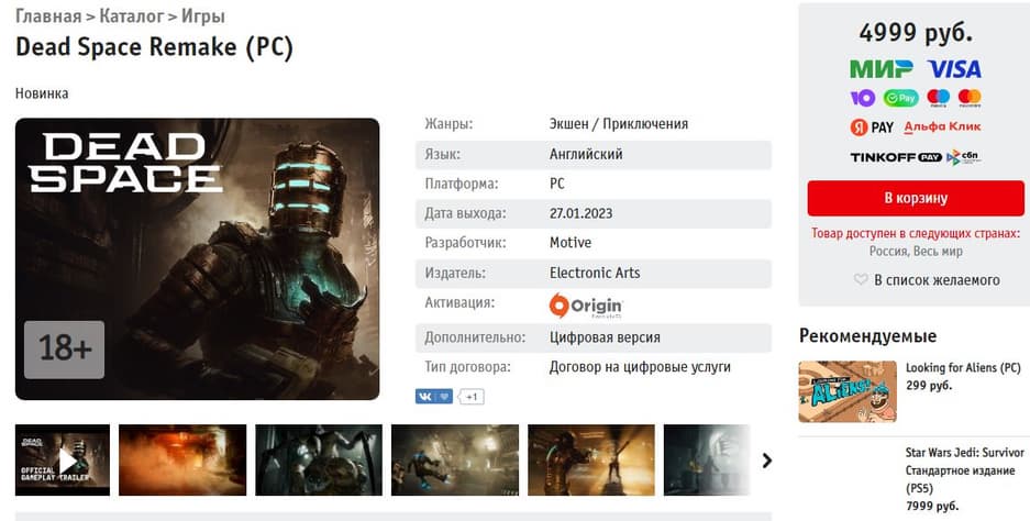 В интернет-магазине «Буки» появились ключи ремейка Dead Space стоимостью 4 999 рублей. Согласно описанию, их можно активировать в России через клиент Origin.