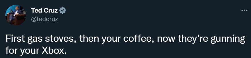 Республиканец Тед Круз (Ted Cruz) указал на то, как всё постепенно раскручивается: «Сначала газовые плиты, затем Ваш кофе, а теперь они нацелились на Ваш Xbox».