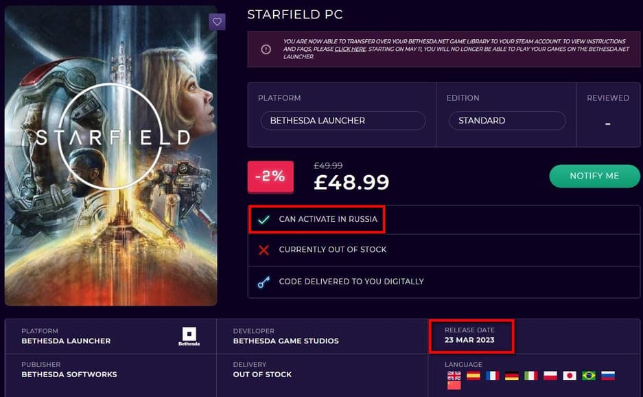 Магазин CDKeys.com, занимающийся продажей ключей для различных игр, указал, что Starfield появится в продаже 23 марта 2023 года. Более того, согласно информации со страницы игры, ключ можно будет активировать в России.