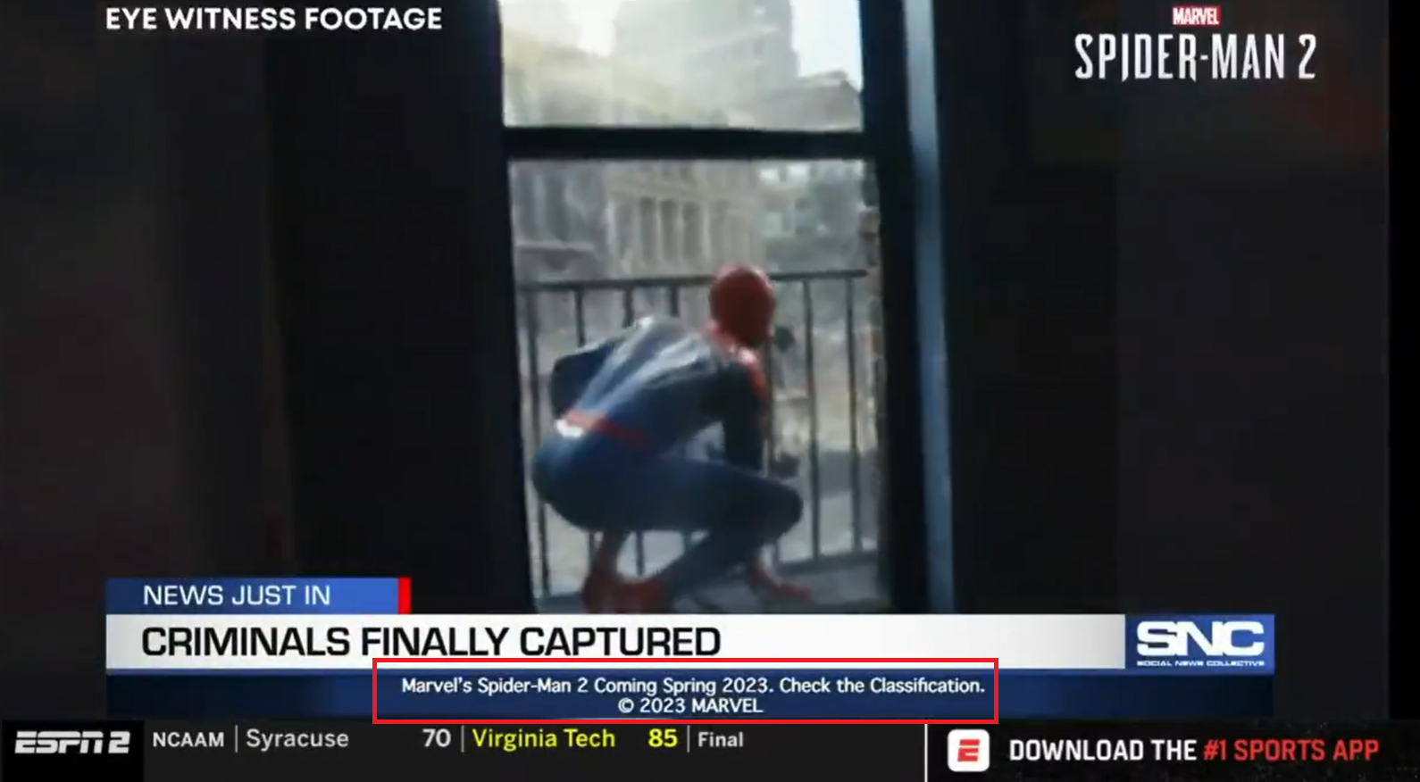 В ролике Marvel's Spider-Man 2 присутствуют живые актёры, а также два Человека-паука, которые помогают схватить несколько преступников. Ролик можно посмотреть по ссылке тут или тут (может не открываться из России).