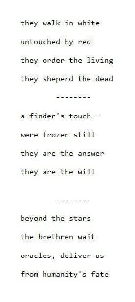Есть мнение, что данный текст отражает будущее серии Dead Space. Например, первые строки связывают с оракулами из Dead Space 2. Фрагмент с застывшими (замороженными) может относиться планете Тау Волантис, месту действия Dead Space 3.