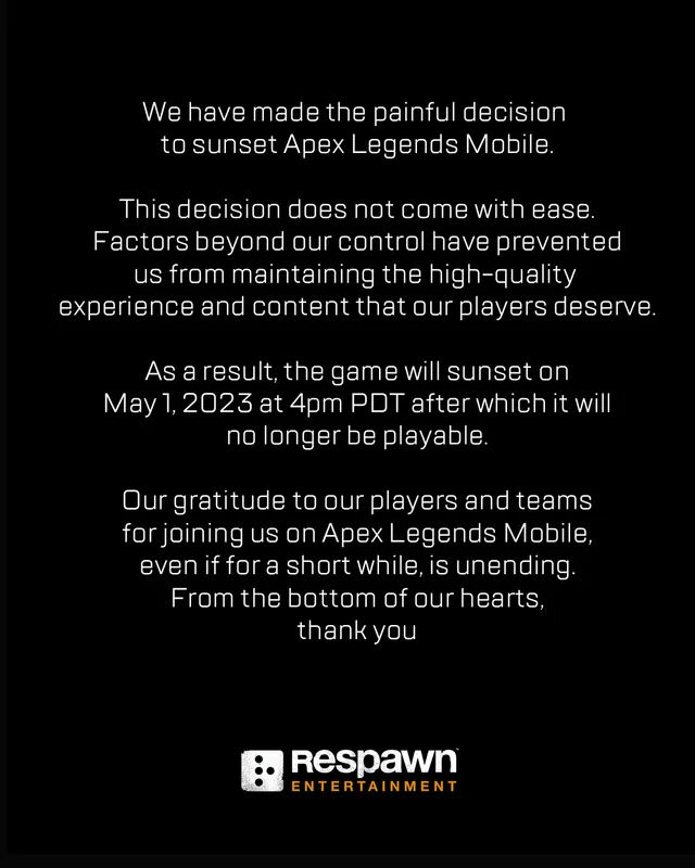 Недавно Electronic Arts объявила о закрытии Apex Legends Mobile. В игру можно было донатить и кто-то вкладывал деньги, ожидая долгий жизненный цикл проекта.