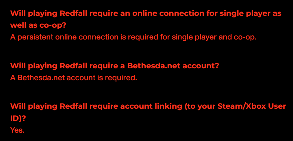 Сообщили о том, что даже для одиночной игры в Redfall необходимо постоянное подключение к Интернету, а также аккаунт Bethesda (и нужна привязка аккаунта к платформе).