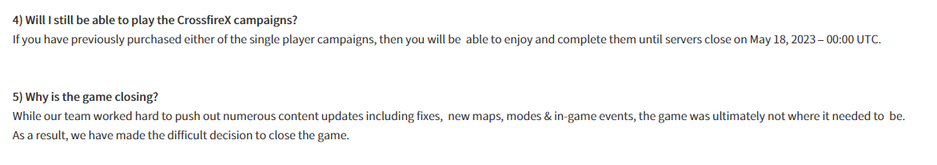 Продажу CrossfireX прекратили, как и выпуск дополнительного контента. Игроки, которые донатили в CrossfireX в последние 2 недели, имеют возможность оформить возврат средств.
