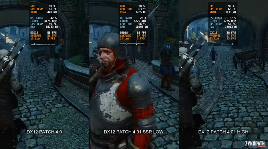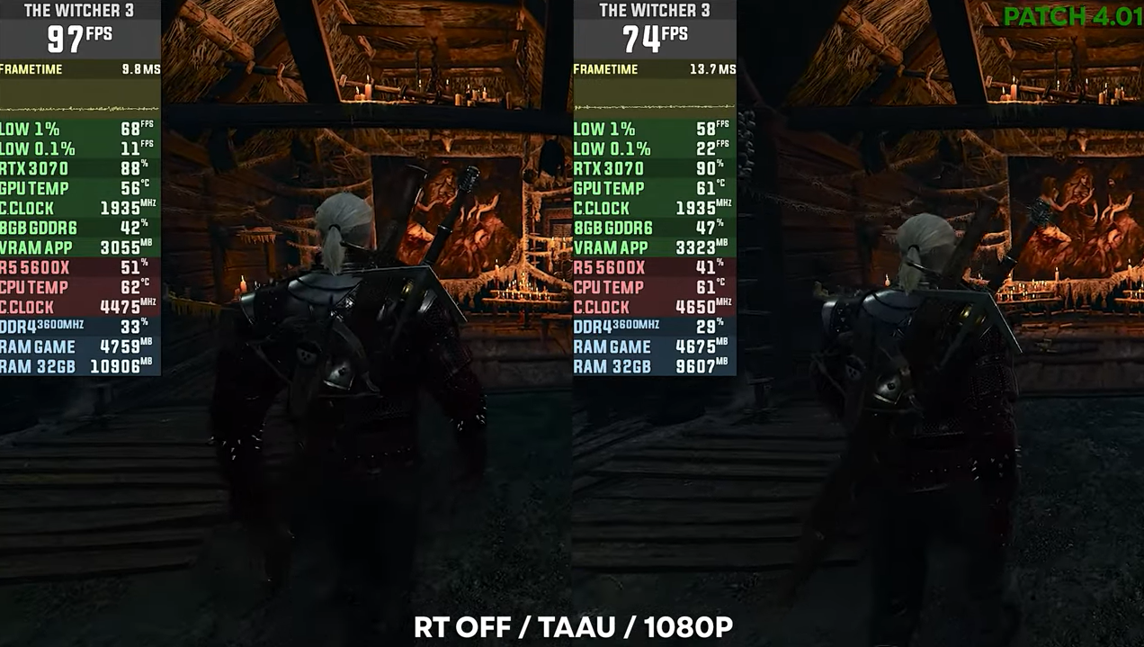 На проблему обратили внимание журналисты и блогеры, они решили провести тестирование The Witcher 3 со спорным патчем 4.01. Действительно, если в The Witcher 3 версии 4.0 игра способна выдавать без трассировки лучей 60-90 FPS, то после установки патча 4.01 частота кадров падает и не поднимается выше 50.