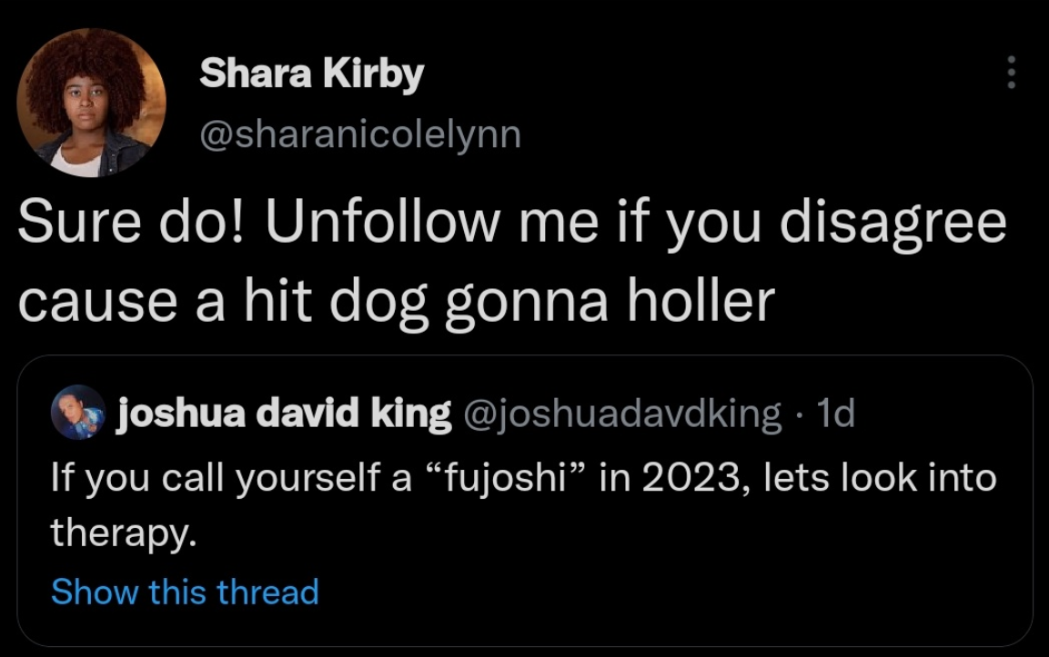 Он* порекомендовал пройти курс терапии тем, кто идентифицирует себя в 2023 году как фудзёси. Под «фудзёси» понимается гетеросексуальная женщина, которая очень интересуется специфическим контентом про очень близкие отношения мужчин.