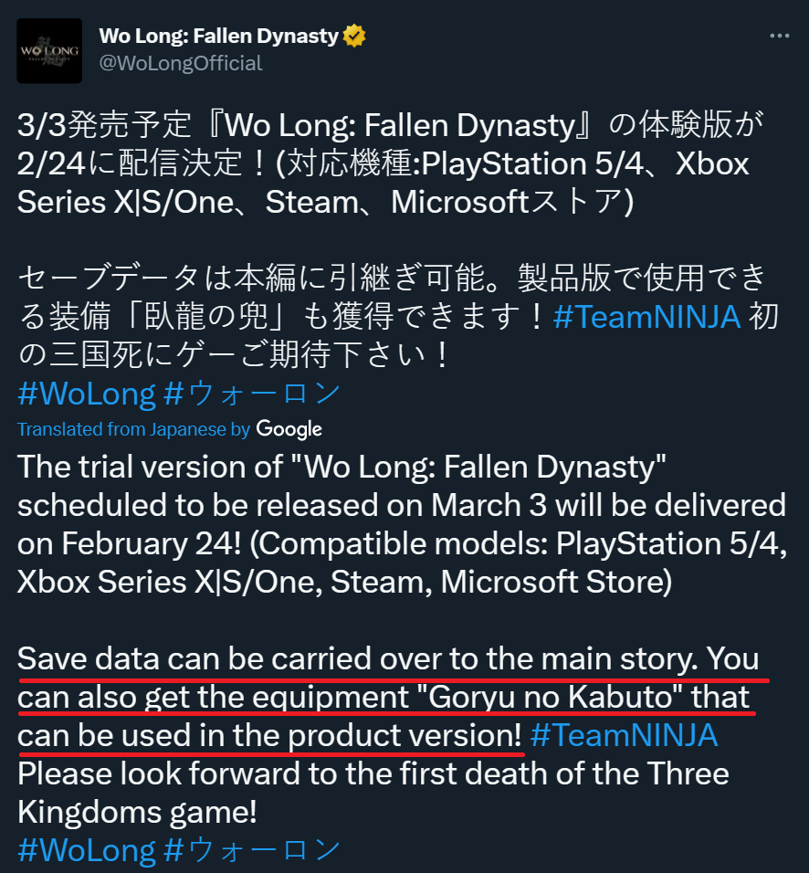 Отметили, что можно будет перенести сохранения в релизную версию Wo Long Fallen Dynasty, а также заполучить снаряжение.