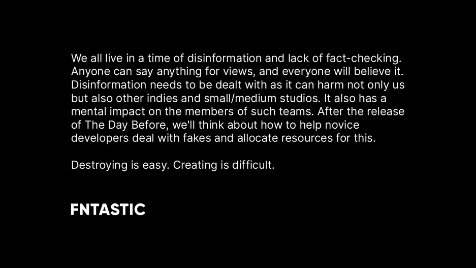 «Мы все живём во времена дезинформации и отсутствия проверки достоверности сведений. Любой может сказать что угодно ради просмотров, и все в это поверят. С дезинформацией нужно бороться, так как она может навредить не только нам, но и другим инди-компаниям и маленьким/средним студиям. Она также оказывает психологическое воздействие на членов таких команд. После релиза The Day Before мы подумаем о том, как помочь начинающим разработчикам справиться с фейками, и выделим на это ресурсы.