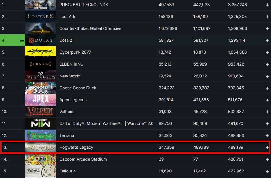 Хотя Hogwarts Legacy выйдет только 10 февраля, пиковое число одновременно активных игроков в Steam в определенный момент составляло 489,139 душ — это второй самый крупный результат для одиночной игры после Cyberpunk 2077.