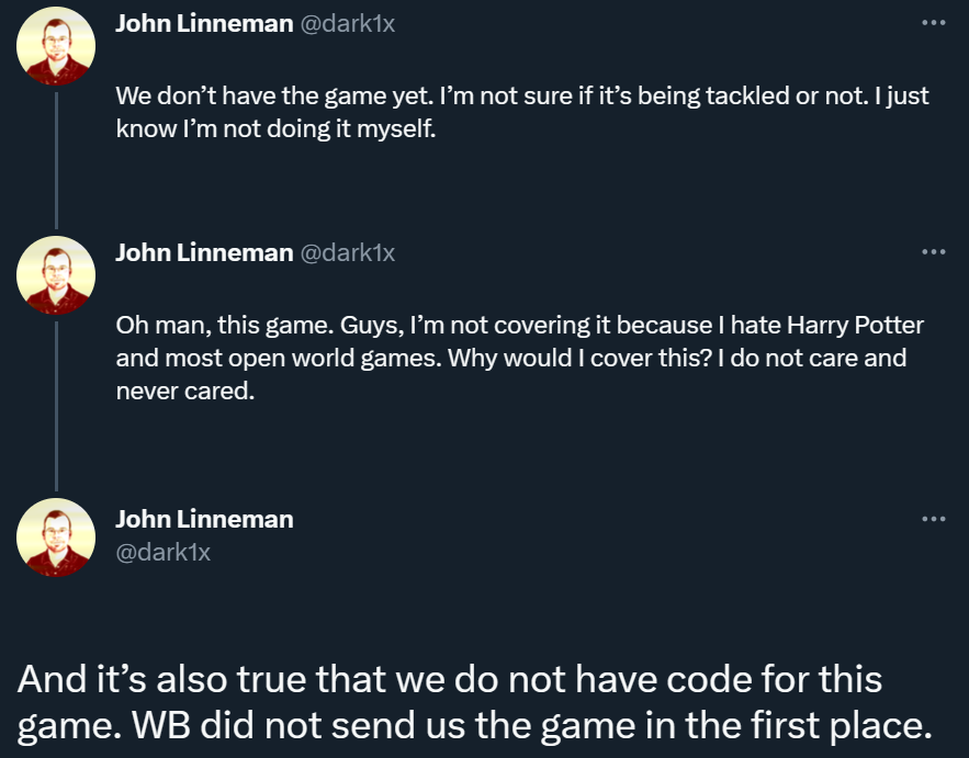 Джон Линнеман (John Linneman) не стал сдерживаться в социальной сети и отметил, что ненавидит большинство игр с открытым миром и франшизу «Гарри Поттер».