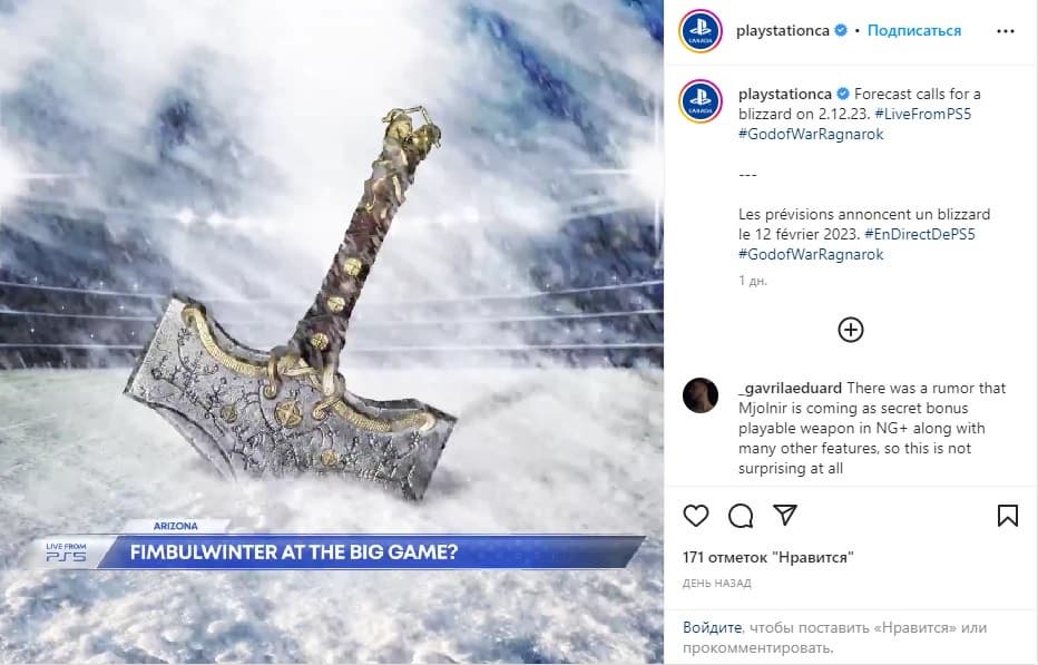 «PlayStation приглашает фанатов следить за своими социальными каналами, чтобы узнать о новых сюрпризах и отметить любимые игры для PS5. Сегодня вороны Одина заметили новый тизер на каналах PlayStation Canada в Instagram и Facebook, анонсирующий Blizzard of Midgard в это воскресенье вечером. Чтобы увидеть, как всё это произойдет, не забудьте посмотреть большую игру в эти выходные!».