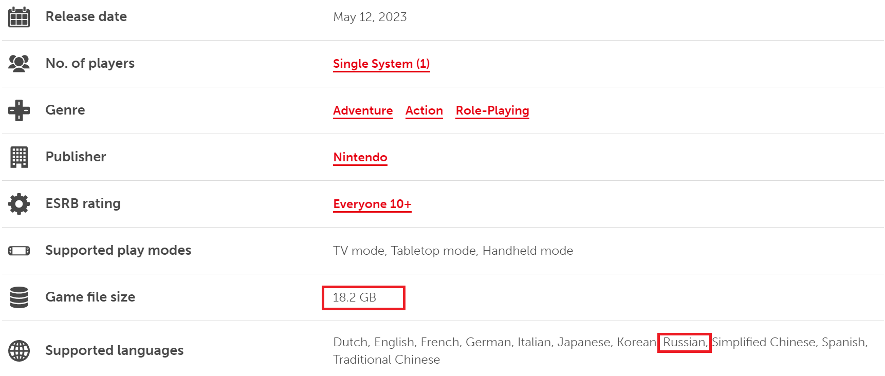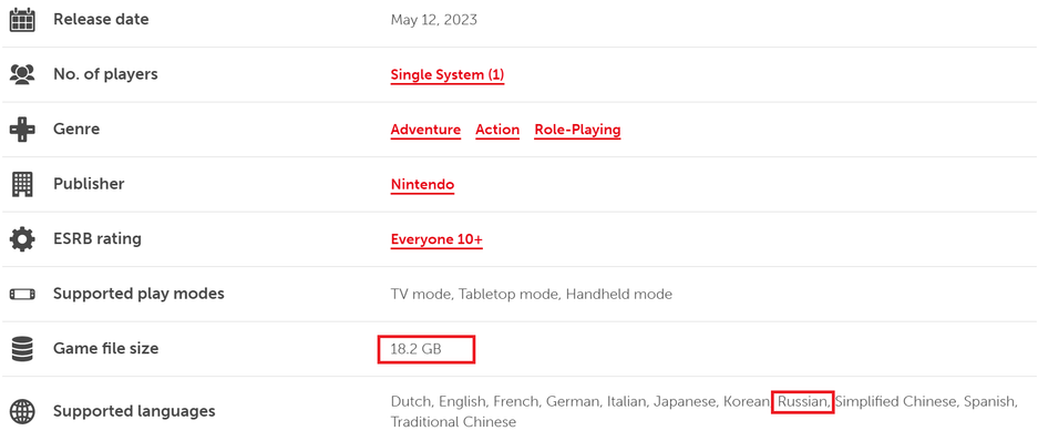 В Nintendo eShop на странице The Legend of Zelda Tears of the Kingdom уточнили данные о весе игры, а также о списке поддерживаемых языков.