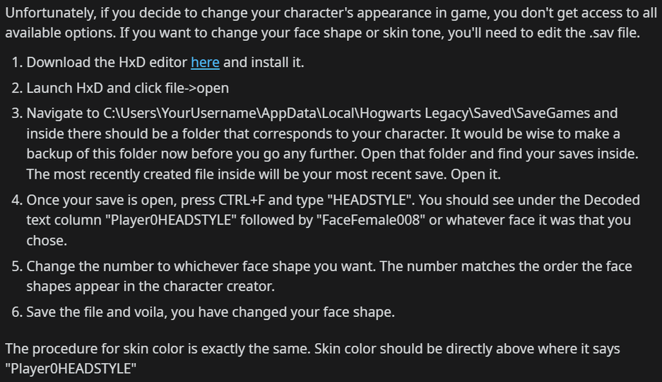 Если при создании персонажа был выбран не «крайний» цвет кожи, то есть альтернативное решение, которое не потребует создавать нового персонажа. Blahblkusoi рассказал, что можно скачать HxD редактор по ссылке, а затем изменить содержимое файла с сохранением.