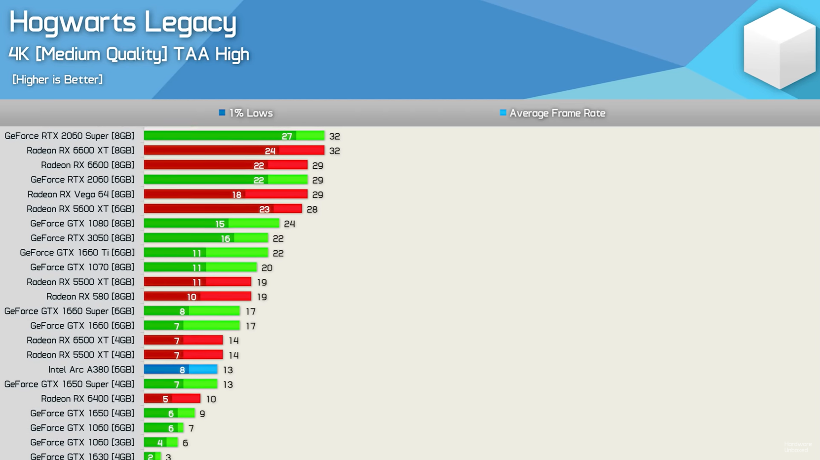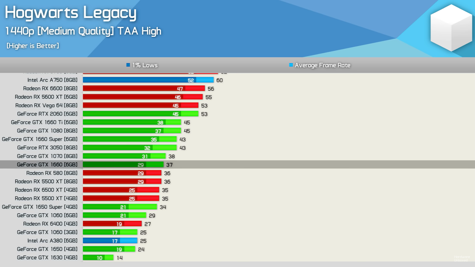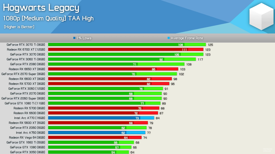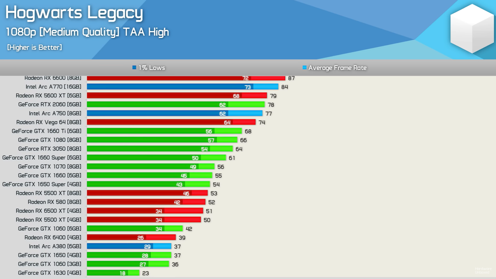 При разрешении 1080p в Hogwarts Legacy на средних настройках можно будет наблюдать 60 FPS с видеокартой GeForce GTX 1660 Super или Radeon RX Vega 64, а для 30 FPS хватит GeForce GTX 1060, Radeon RX 6400 или Intel Arc A380.