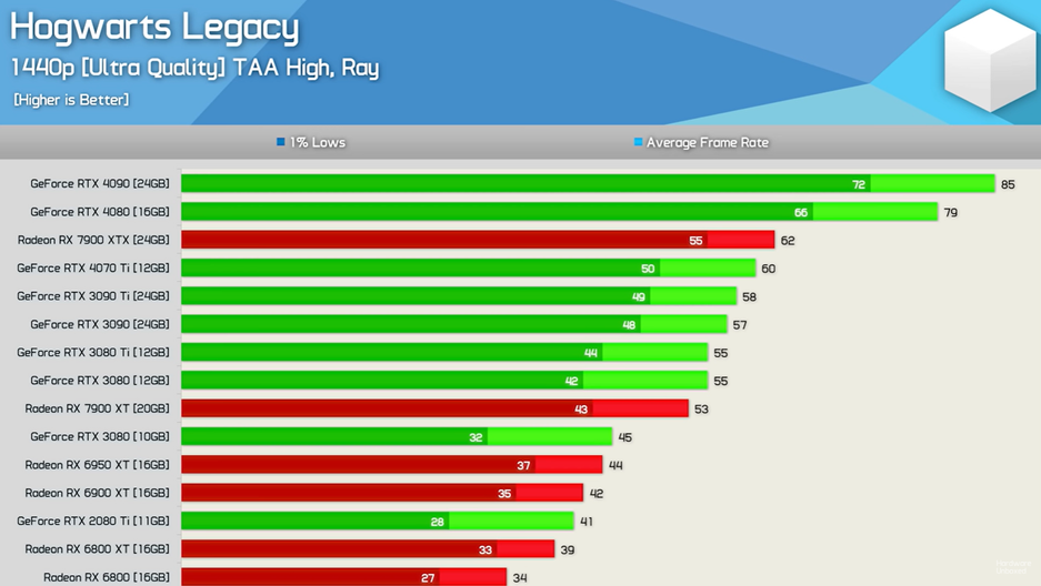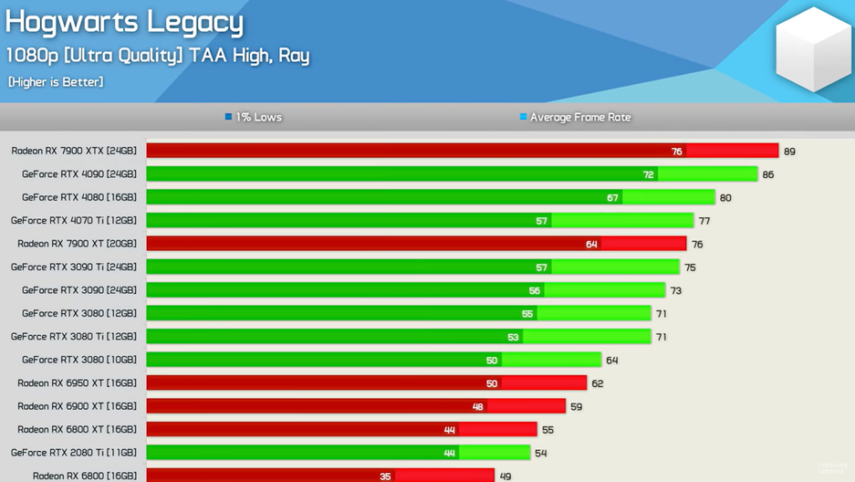 Hogwarts Legacy запускали с трассировкой лучей и без. Игру оценили в разрешении 1080p, 1440p и 4K. Выставляли разнообразные настройка графики. Получилось так, что в некоторых тестах современная видеокарта GeForce RTX 4090 уступала Radeon RX 7900 XTX.