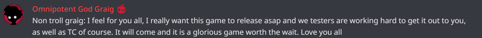 Graig заявил: «…Я сочувствую вам всем, я действительно очень хочу, чтобы эта игра вышла как можно скорее, и мы, тестеры, усердно работаем, чтобы добиться этого, как и [Team Cherry], конечно. Она выйдет, и это великолепная игра, которая стоит того, чтобы её ждать. Всех люблю».
