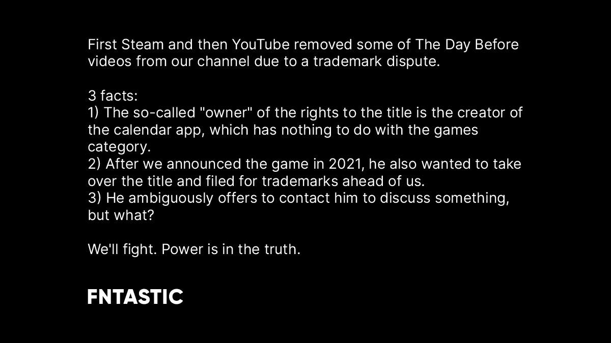 Как утверждают разработчики из Fntastic, за удаление (отправку жалобы) несёт ответственность человек, который зарегистрировал торговую марку The Day Before: