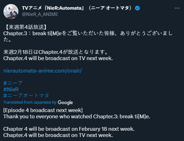 В социальной сети авторы аниме NieR Automata Ver1.1a подтвердили возвращение серила. Премьера четвёртого эпизода NieR Automata Ver1.1a запланирована на 18 февраля.