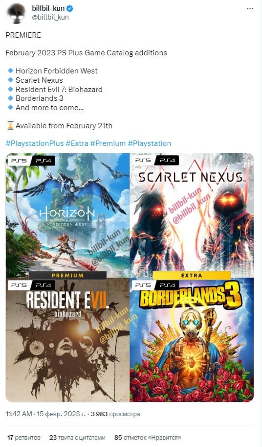 Компания готовит не менее десятка игр для пользователей PS Plus Premium и PS Plus Extra. Тем временем, опережая официальную новость, billbil-kun, инсайдер, который неоднократно доказывал, что имеет доступ к закулисной информации, раскрыл первые игры. Скорее всего, в феврале в сервисе появятся Horizon Forbidden West, Scarlet Nexus, Resident Evil 7: Biohazard и Borderlands 3. При этом инсайдер подчеркивает, что это лишь некоторые из предложений в полной линейке.