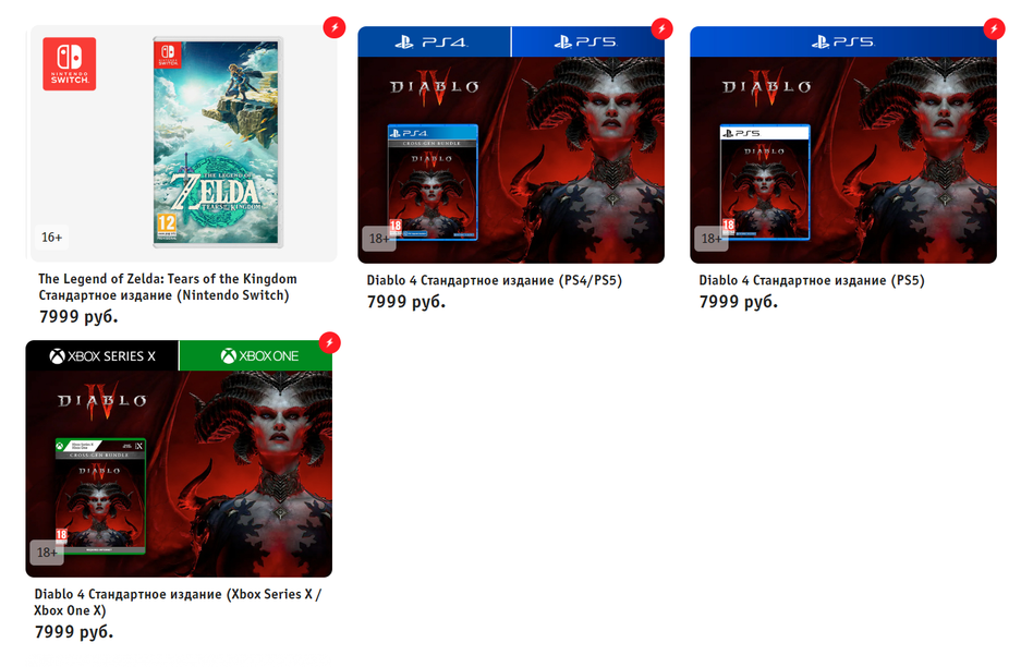 Физические копии Diablo 4 для PlayStation и Xbox, а также The Legend of Zelda Tears of the Kingdom для Nintendo Switch стоят 7999 рублей (стандартное издание игры).