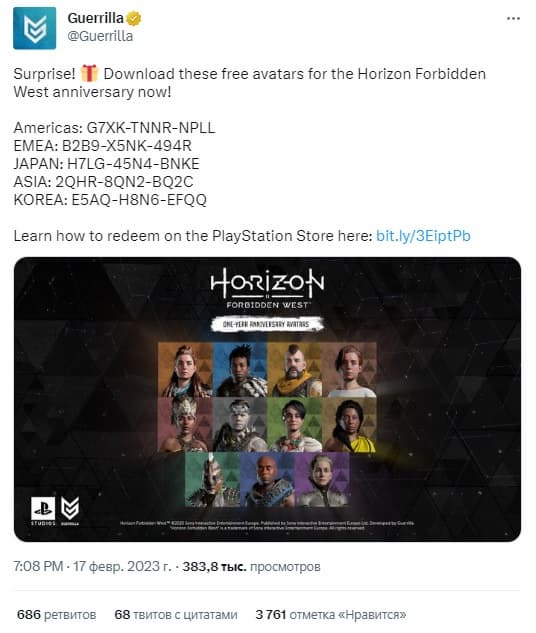 18 февраля 2022 года состоялся релиз Horizon Forbidden West, поэтому Guerrilla Games благодарит за поддержку и раздаёт аватары фанатам постапокалиптического мира.