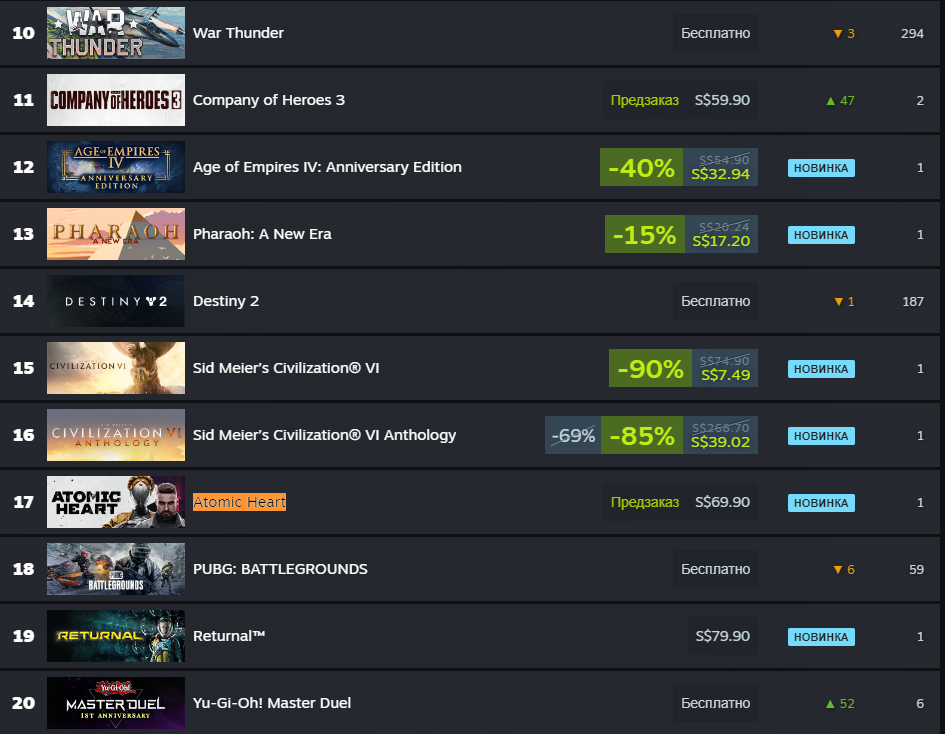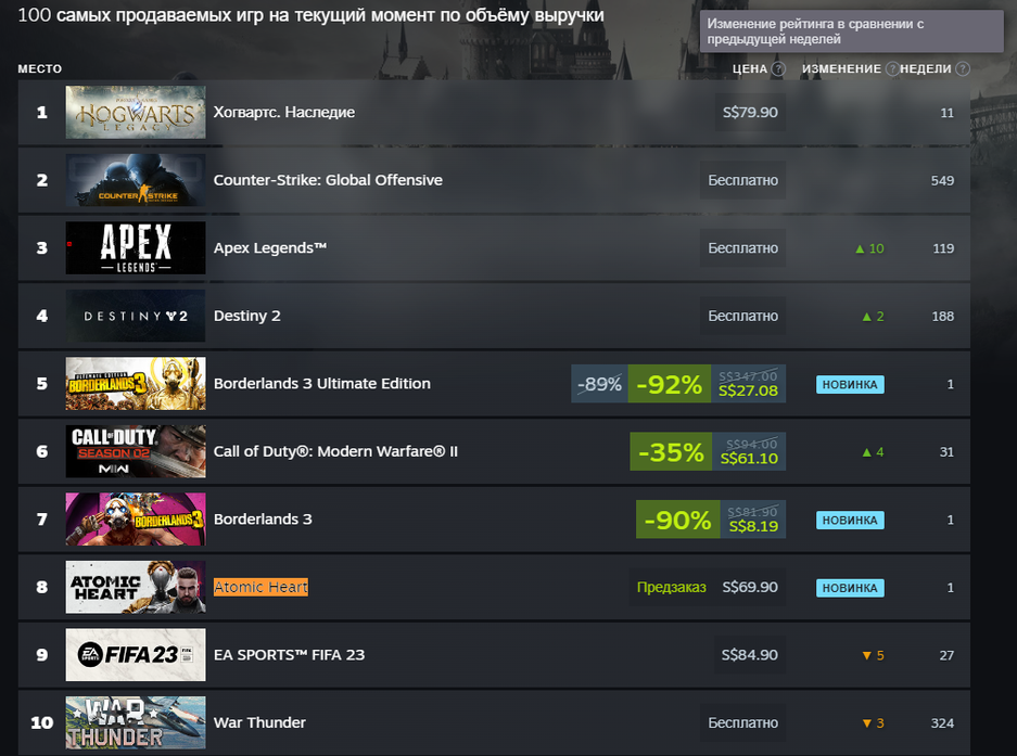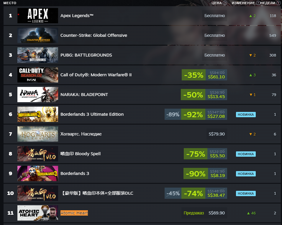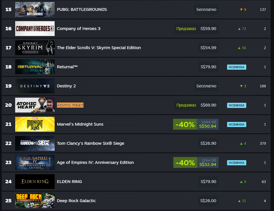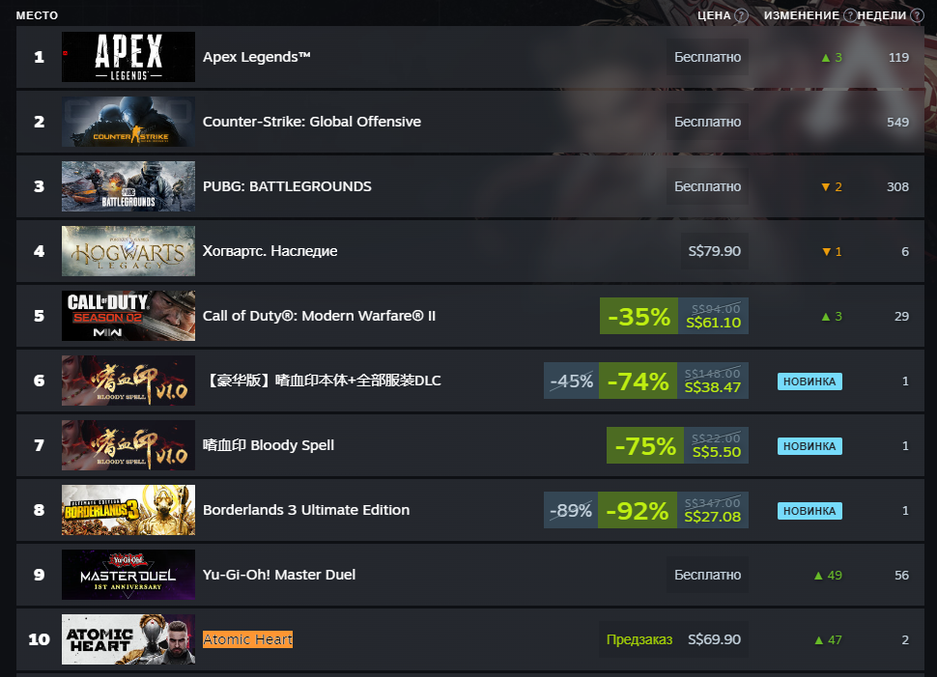 Зато Atomic Heart есть в Steam для многих других регионов. Valve недавно обновила чарты продаж, позволив отслеживать продажи игр в разных регионах в реальном времени.