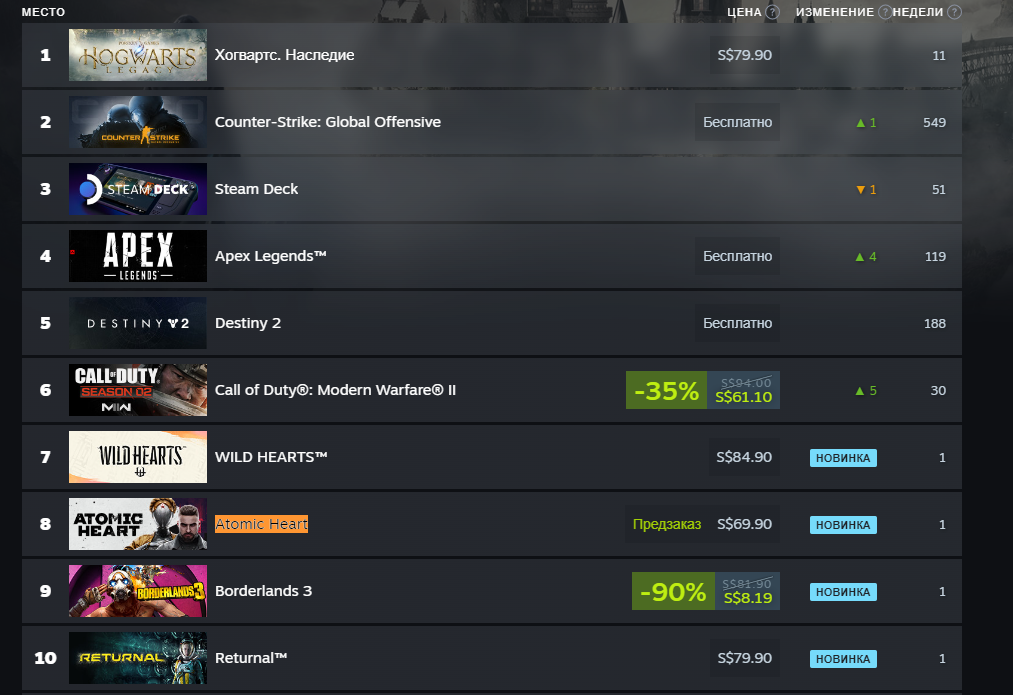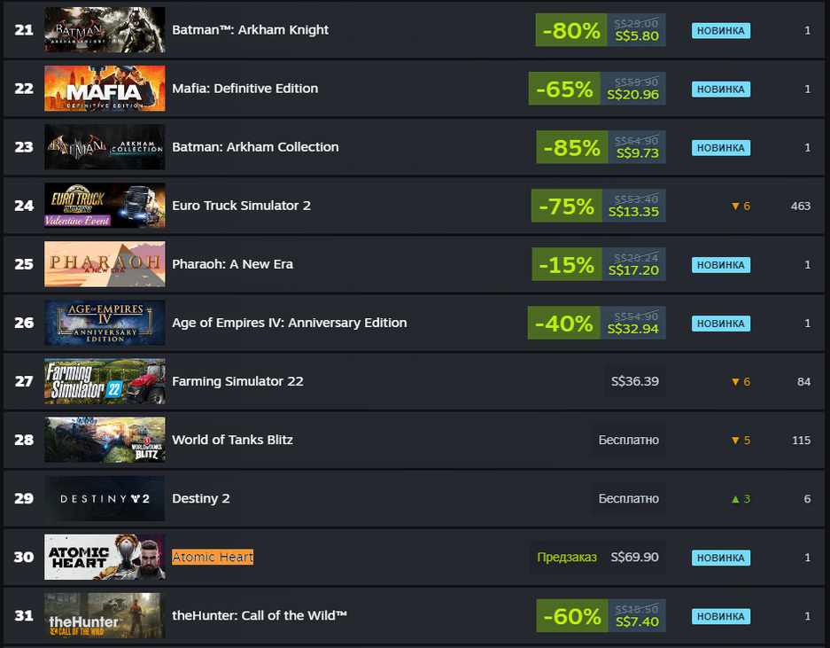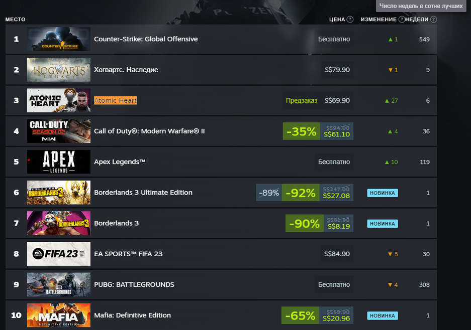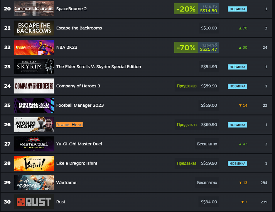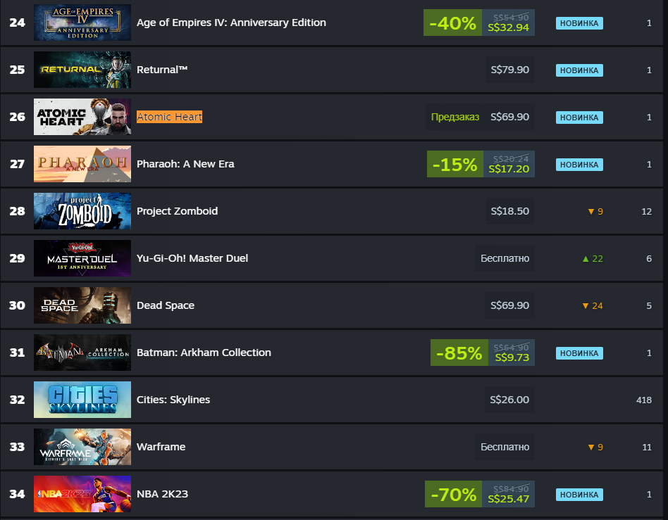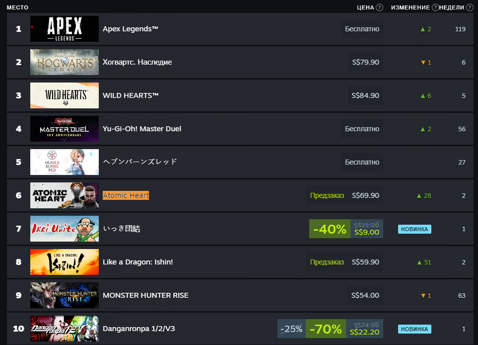 Зато Atomic Heart есть в Steam для многих других регионов. Valve недавно обновила чарты продаж, позволив отслеживать продажи игр в разных регионах в реальном времени.