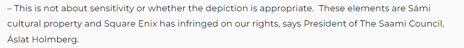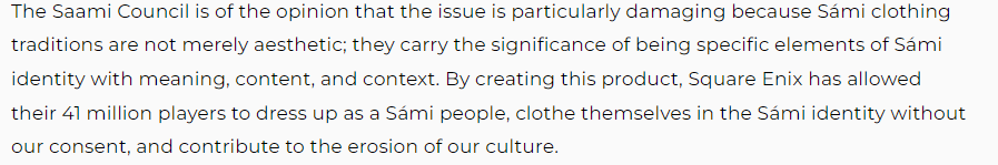 «…Square Enix позволила 41 миллиону своих игроков переодеваться в Sámi [саамов], примерять саамскую "идентичность" без нашего согласия и способствовать эрозии нашей культуры [традиции саамской одежды не просто несут "эстетический характер", они имеют значение как специфические элементы саамской идентичности со смыслом, содержанием и контекстом]».