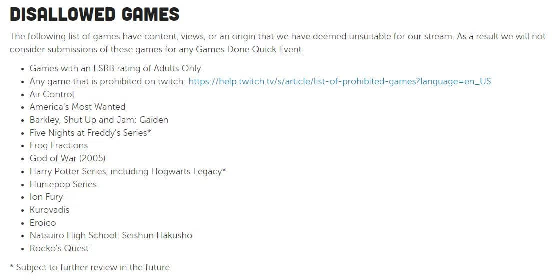 Организация Games Done Quick, занимающаяся проведением турниров по скоростному прохождению различных игр, заявила о том, что игры во вселенной «Гарри Поттера» и Hogwarts Legacy в частности не будут представлены на будущих мероприятиях.