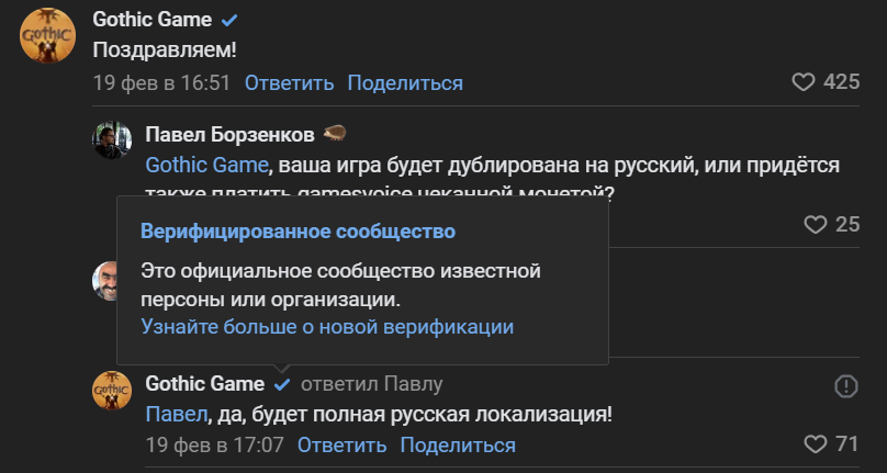 Внимание привлёк один из комментариев. Представитель сообщества Gothic Game (верифицированное) поздравил команду GamesVoice с успешным сбором средств.