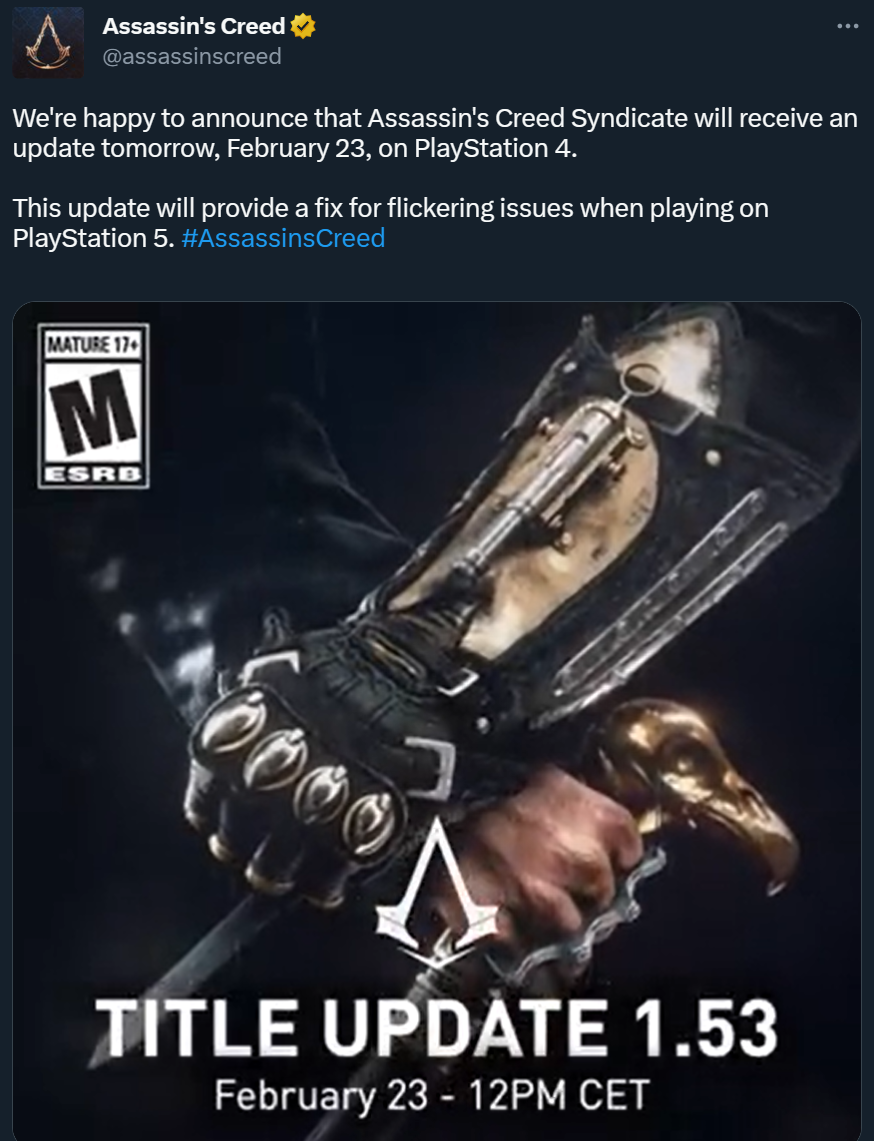 При этом данный патч Assassin’s Creed Syndicate предназначен для консолей PlayStation. Ожидается, что этот патч исправит мерцание изображения на PlayStation 5.