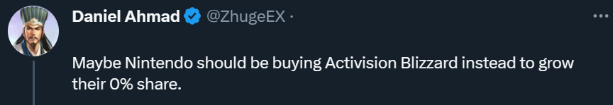 Microsoft быстро подкололи и припомнили, что внутренние студии выпускают мало хорошо игр: «Возможно, Nintendo стоит купить Activision Blizzard, чтобы увеличить свою долю в 0%»