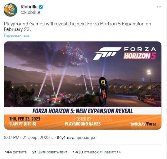 Команда в официально Twitter подтвердила, что второе дополнение для Forza Horizon 5 анонсируют сегодня (23 февраля) во время трансляции на Twitch. Это платное DLC, входящее в сезонный пропуск.