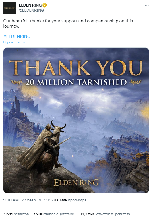 Лучшая игра 2022 года по версии The Game Awards и редакций многих изданий, Elden Ring, получила новое достижение. Продано более 20 миллионов копий и установлен новый рекорд продаж для одной игры в истории FromSoftware. Сообщение о рекордных продажах опубликовано в Twitter.