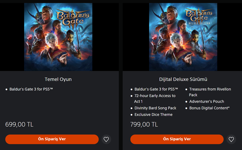 В турецком PlayStation Store открыли предзаказ Baldur's Gate 3. Можно приобрести стандартное издание за 699 лир или Deluxe-издание за 799 лир, в комплект входит 72-часовой ранний доступ к первому акту.