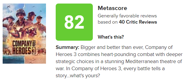 TOXIFOX так описывает текущее положение дел с Company of Heroes 3: «Полный рескин. Очень сырая игра, [настроек] матчей нет, рейтинговых матчей нет. Поиск катки долгий. не чувствуются вообще попадания по танкам, т.е вообще ну никак. Короче, игра безумно сырая, брать только с большой скидкой».