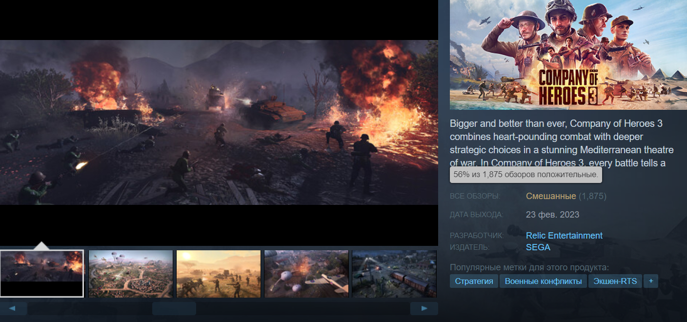 При этом на странице Company of Heroes 3 в Steam обзоры смешанные. Положительных лишь 56%, игроки не очень довольны тем, что приготовила Relic Entertainment.