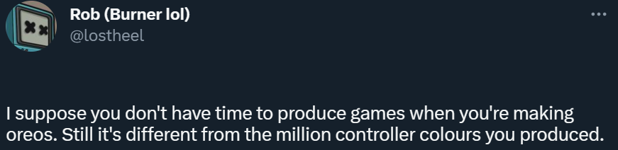 Rob (Burner lol) возмутился: «Я полагаю, у вас нет времени на производство игр, когда вы делаете Oreo. Но всё же это отличается от миллиона разноцветных контроллеров, которые вы производили [для Xbox часто представляют контроллеры в различных расцветках]».