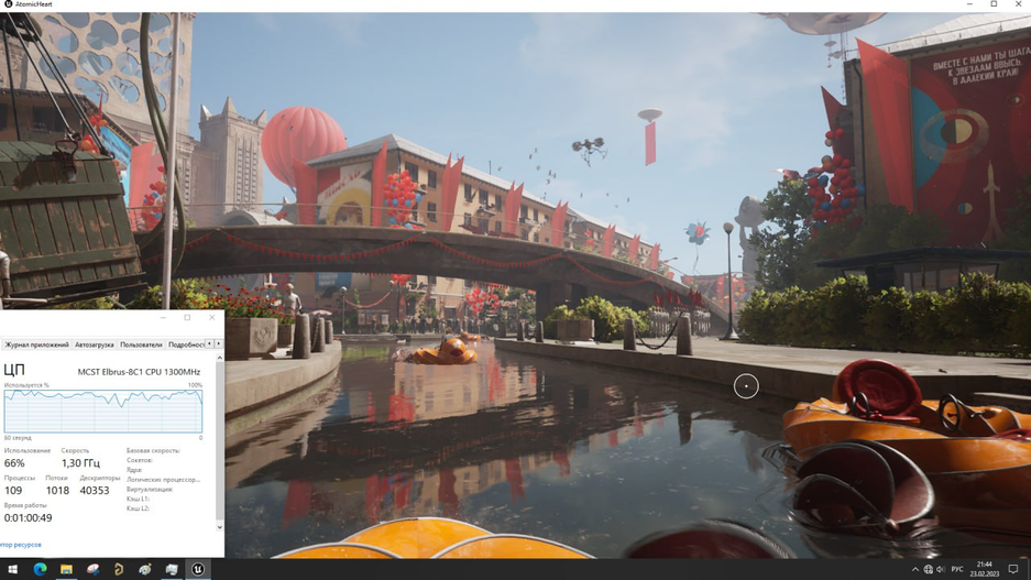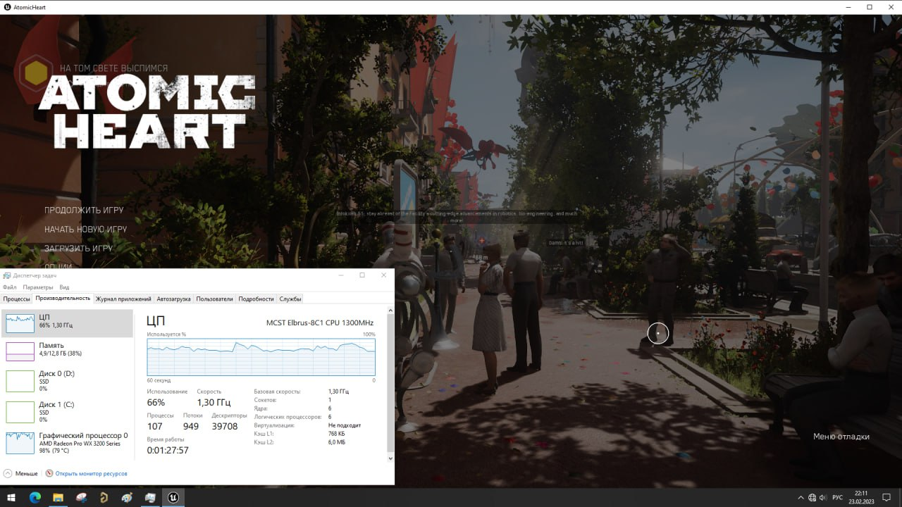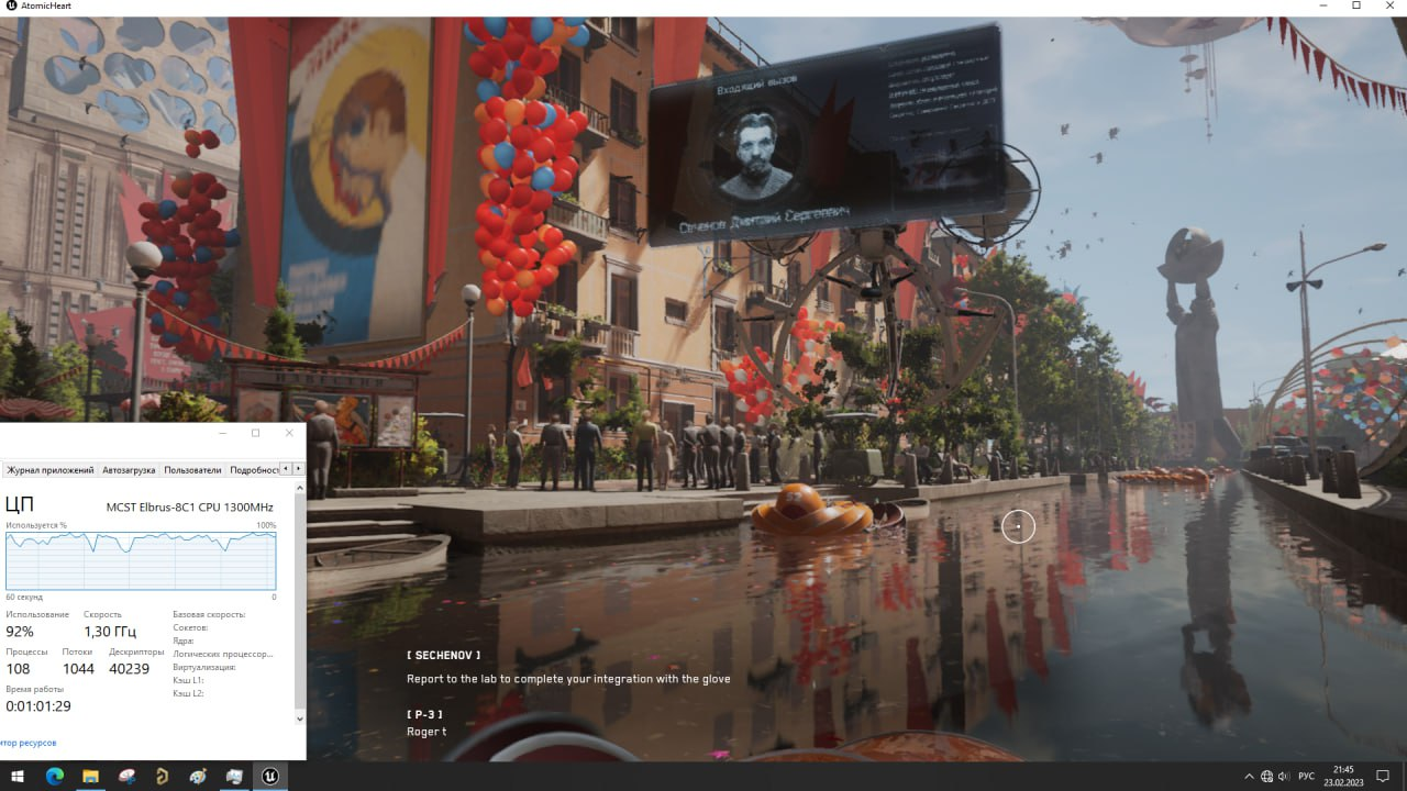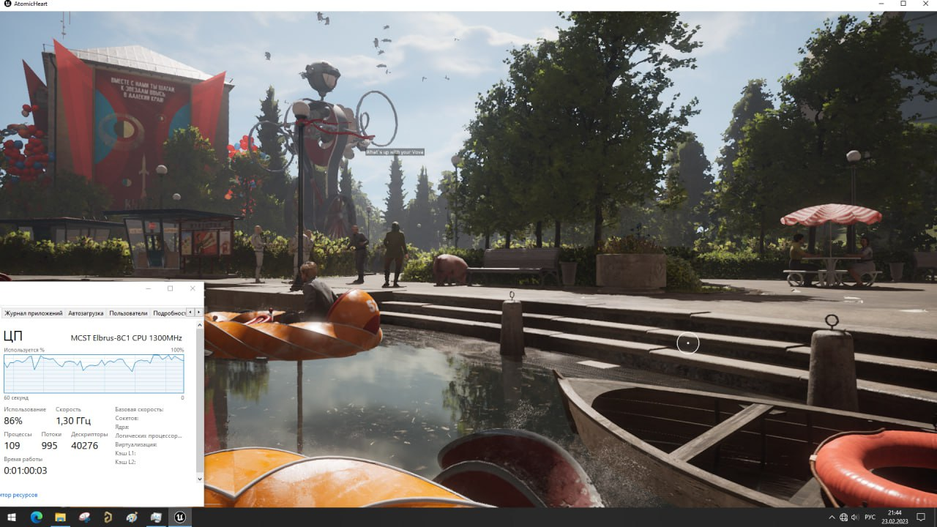 Ge0gr4f протестировал Atomic Heart на российском процессоре Эльбрус-8С. Игра запускалась с использованием связки Lintel (двоичный транслятор) и Windows 10.