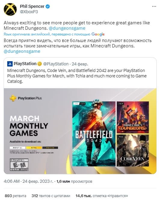 Microsoft всё ещё борется с Sony за возможность приобретения Activision Blizzard, но даже в этой ситуации Фил Спенсер выступил с сообщением, в котором прорекламировал список игр мартовского PS Plus.