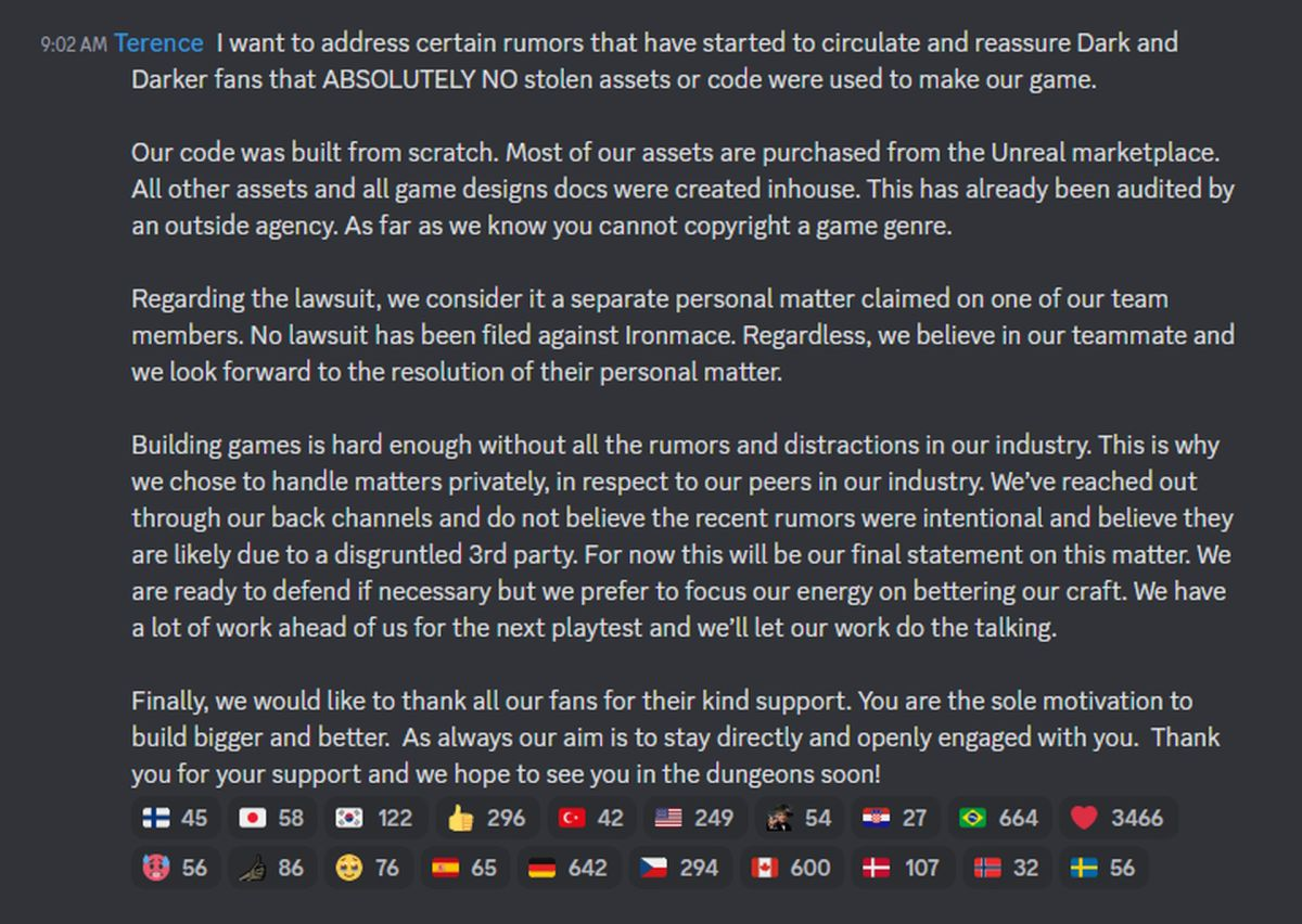 Разработчики IRONMACE утверждают, что код создан с нуля и не используются украденные ассеты: создавались самостоятельно или покупались на Unreal Marketplace. Dark and Darker уже проверяло внешнее агентство: «Насколько нам известно, вы не можете защищать целый жанр игр авторским правом». Заявили, что иск против самой IRONMACE не подавали, упомянутый иск касается лишь одного из членов команды.