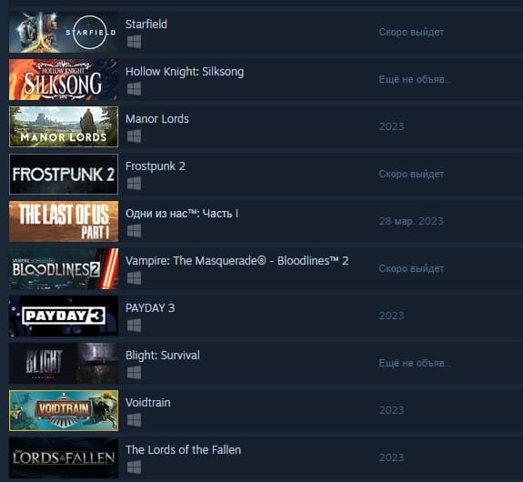 В тройку попали платформер-метроидвания Hollow Knight: Silksong и средневековая стратегия Manor Lord. Также стоит отметить интерес к ПК-версии The Last of Us: Part I от Naughty Dog.