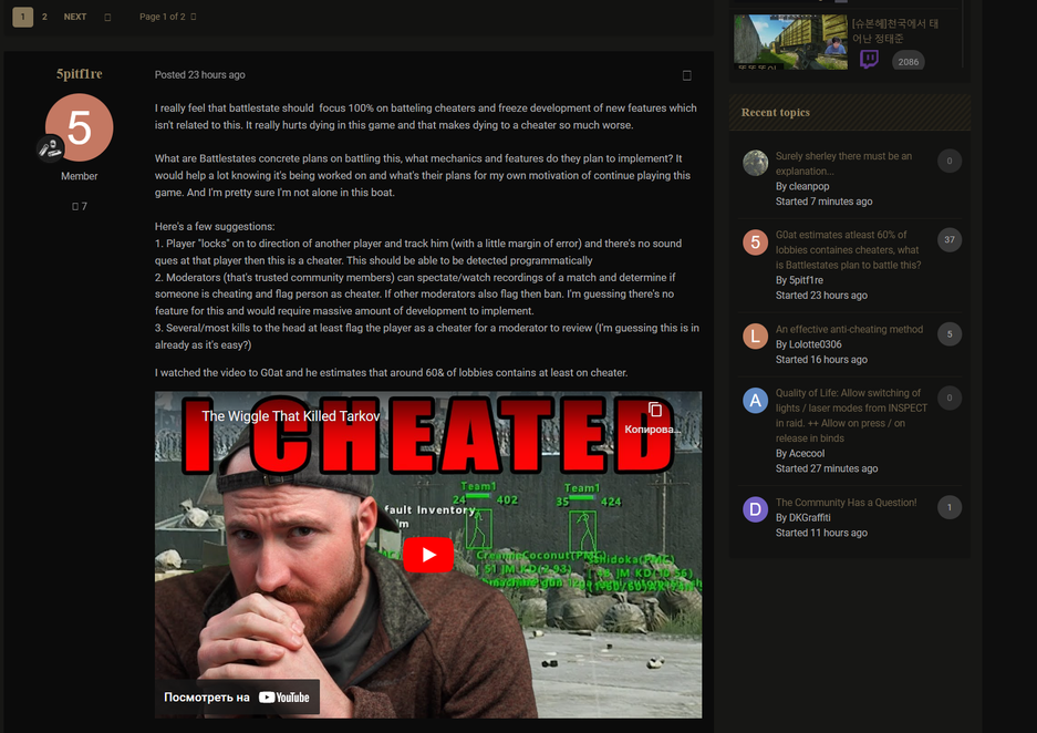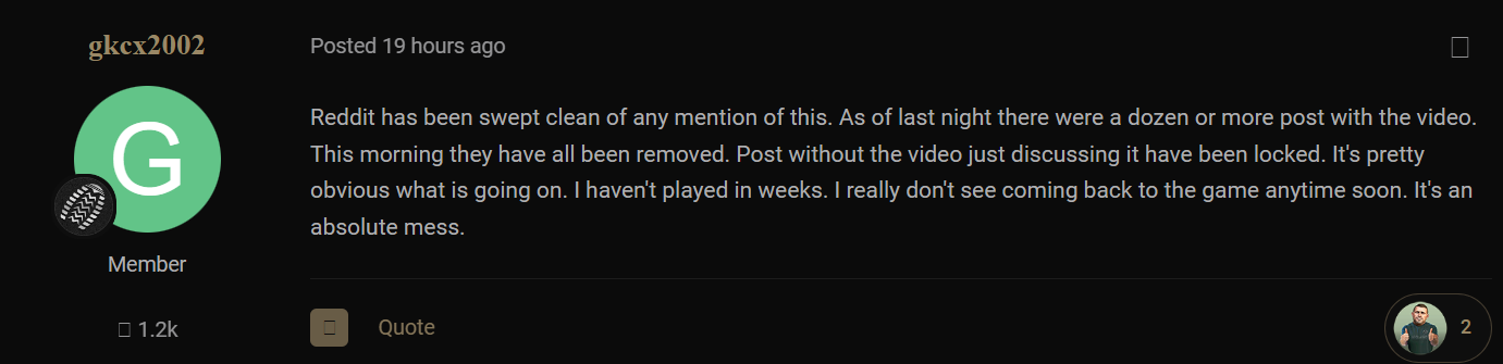 В теме также упоминалось, что сообщество Escape from Tarkov на Reddit зачистили от упоминаний расследования g0at. Самого блогера тоже забанили в сообществе EfT на Reddit (есть формальный повод — он нарушил правило: запрещено показывать геймплей «глазами читера»; ранее блогер пытался использовать сообщество для продвижения роликов и неоднократно нарушал правила).
