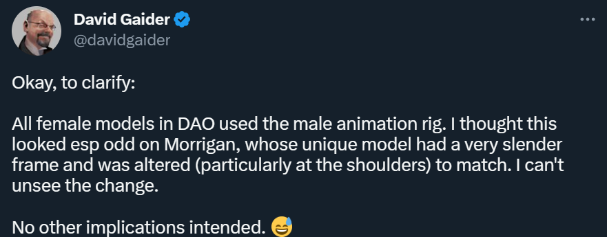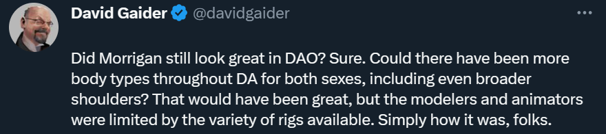 Выглядит ли Морриган в DAO по-прежнему великолепно? Конечно. Могло бы быть больше типов тела в DA для обоих полов, включая даже более широкие плечи? Это было бы здорово, но моделисты и аниматоры были ограничены доступным разнообразием ригов…».