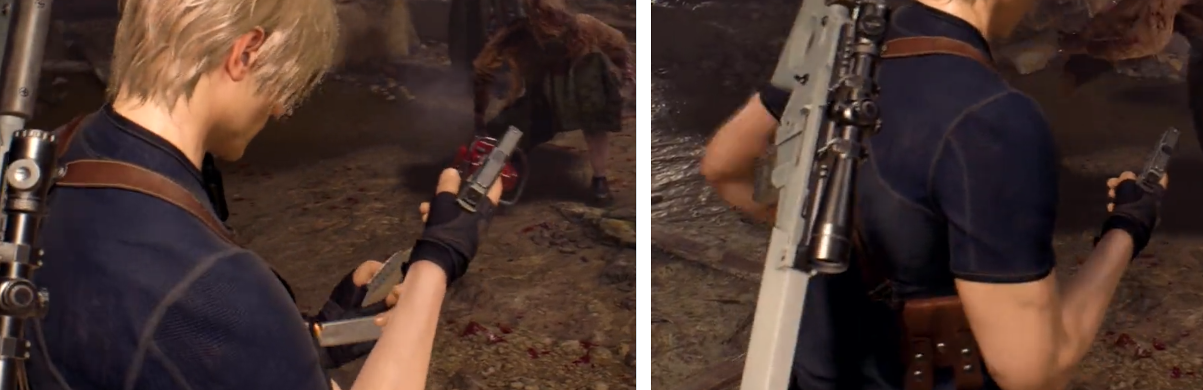 Capcom всё же немного не доработала перезарядку, поскольку из использованной обоймы торчит патрон. Сейчас получается, что Леон заменяет полную обойму на полную обойму.