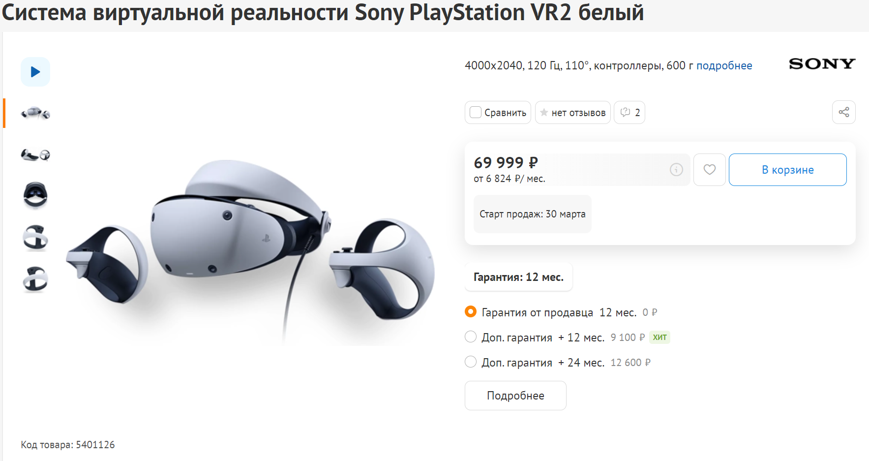 В DNS Sony PlayStation VR2 (белый) предлагают предзаказать за 69999 рублей, в наличии гарантия на 12 месяцев. Можно получить доп. гарантию на 12 или 24 мес. за 9100 или 12600 рублей соответственно.