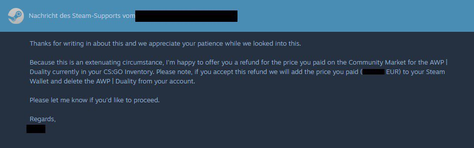 Первое обращение в поддержку Steam закончилось неудачей, ему послали отписку о том, что скин заменили «по юридическим причинам» и транзакции на Торговой площадке Steam окончательны и не могут быть отменены / нельзя вернуть средства. Знакомый L4GX2 получил аналогичную отписку.
