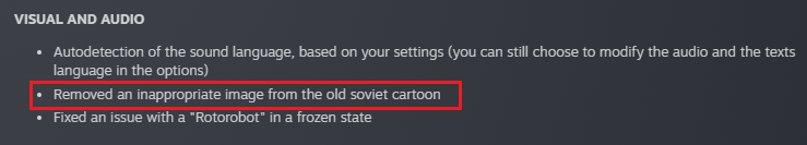 Для Atomic Heart вышел патч 1.3.3.0, который приносит в игру не только исправления, но и цензуру: «Удалено неуместное изображение из старого советского мультфильма». Для Steam дополнительно выпустили патч 1.3.3.1 с исправлениями.